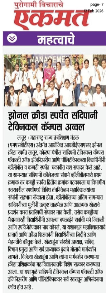 सांदिपनी टेक्निकल कॅम्पस, कोलपा, लातूर येथील विद्यार्थिनींनी IEDSSA झोनल स्पर्धेत आपल्या खेळाचा दमदार जलवा दाखवला. दिनांक 6 फेब्रुवारी 2026 रोजी झालेल्या या स्पर्धेत सांदिपनीच्या वाघिणींनी व्हॉलीबॉलमध्ये प्रथम क्रमांक (Winner) पटकावला, तर कबड्डीमध्ये उपविजेतेपद (Runner-Up) मिळवून कॉलेजचे नाव अभिमानाने उंचावले. विद्यार्थिनींच्या या उत्कृष्ट कामगिरीमुळे संस्थेच्या क्रीडा परंपरेला नवा गौरव प्राप्त झाला आहे.