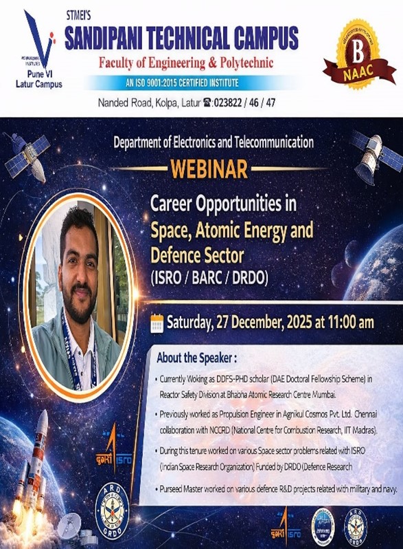 The Department of Electronics and Telecommunication successfully organized a webinar on Career Opportunities in the Space, Atomic Energy, and Defense sectors.